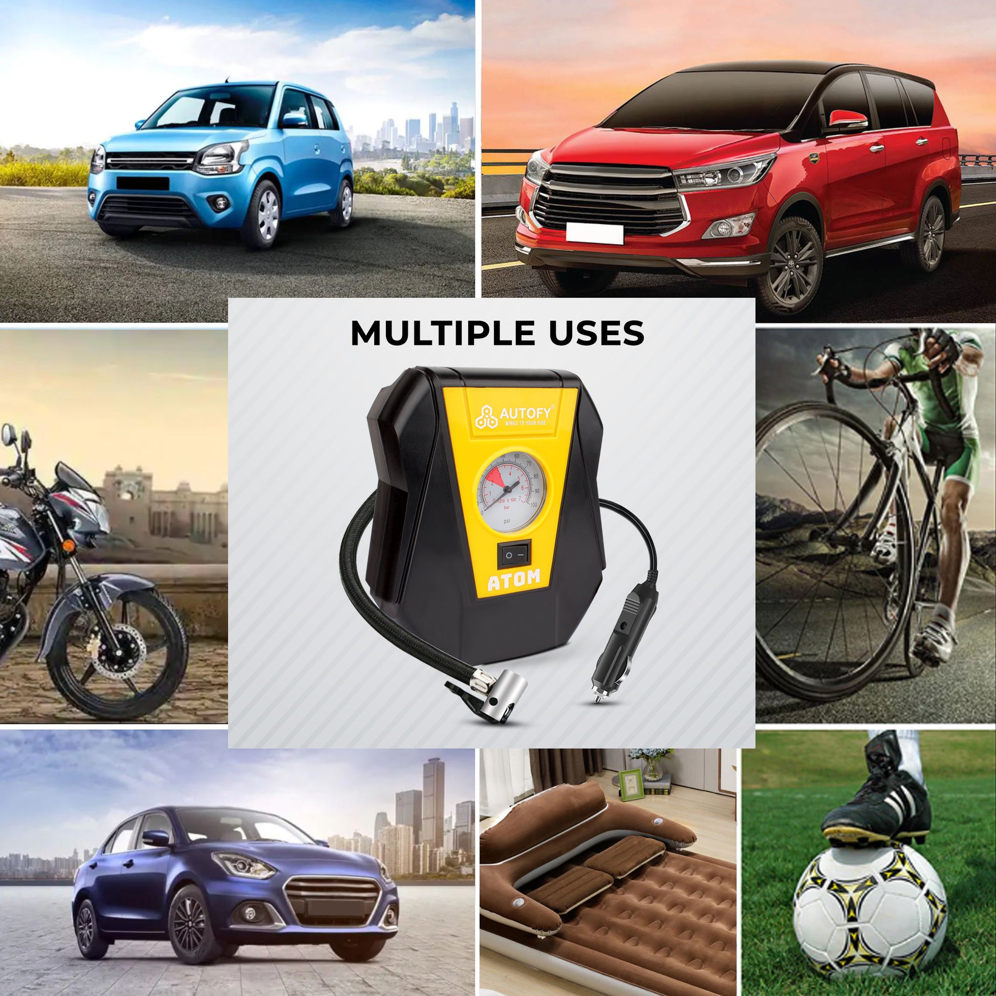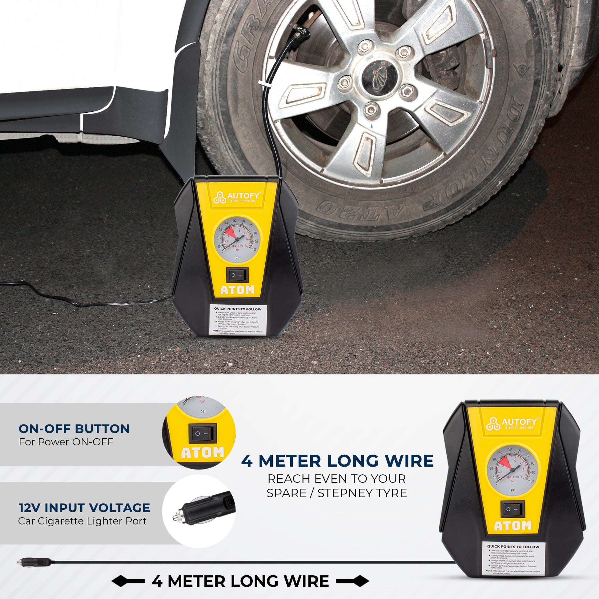 The Autofy ATOM Tyre Inflator can handle up to 100 PSI of air pressure, making it powerful enough for all cars, bikes, and even SUVs, and making this Inflator a universal fit.