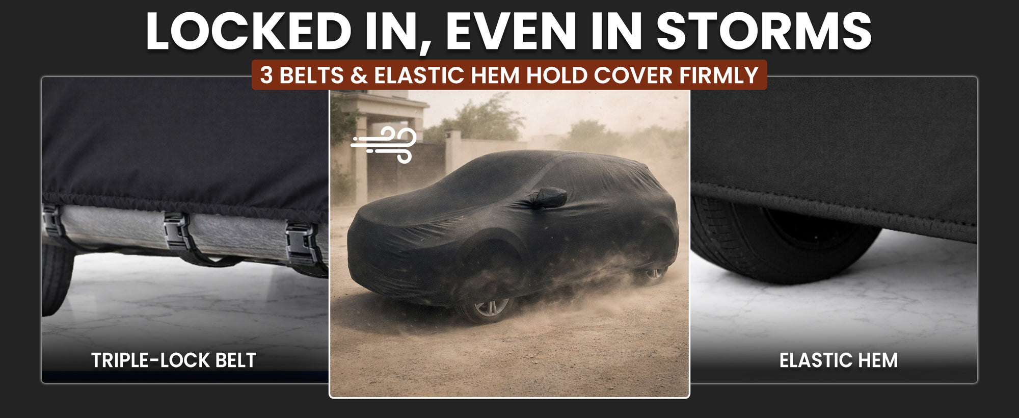 Yes, 3 body belts and an elastic bottom ensure the cover stays firmly in place, even during heavy winds or rain.