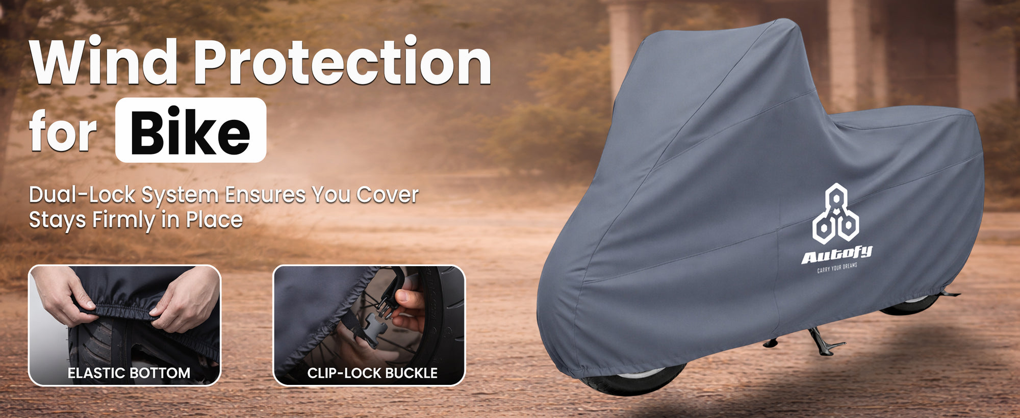 Yes. The cover comes with an elastic hem and securing strap that ensures a snug fit. It provides full coverage till the tyres and stays firmly in place even during strong winds or storms.