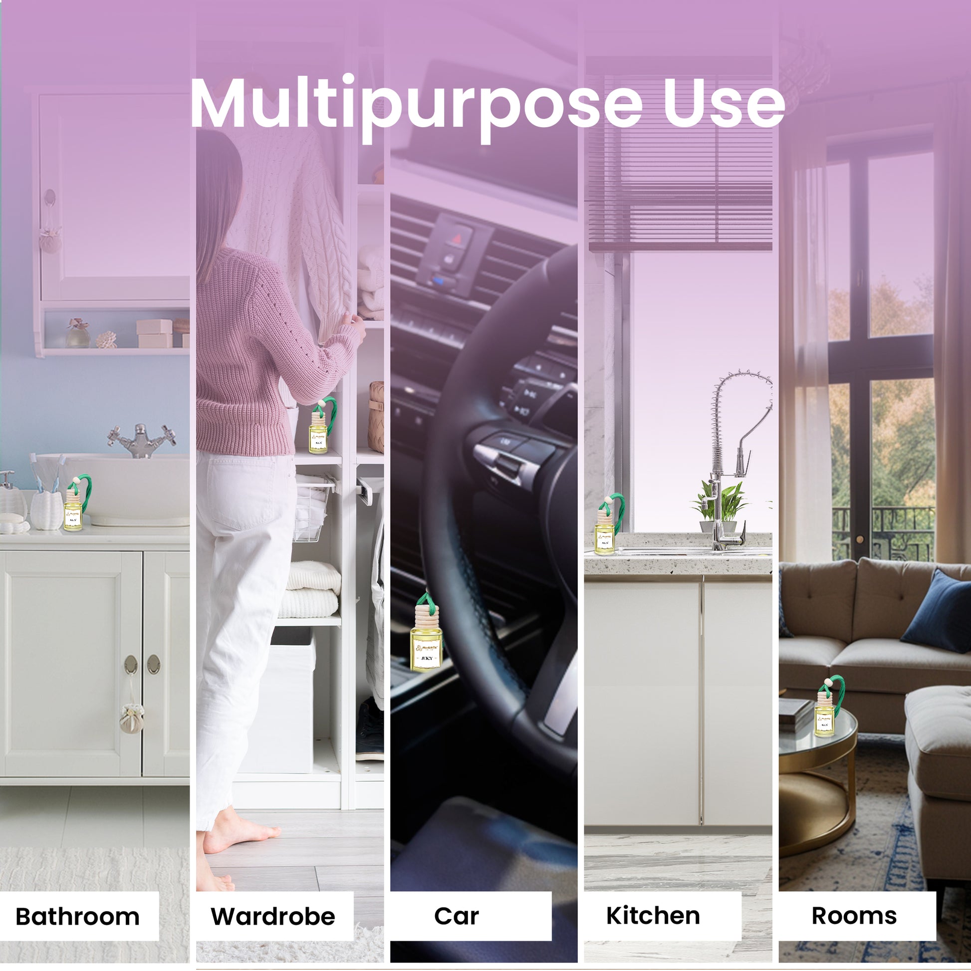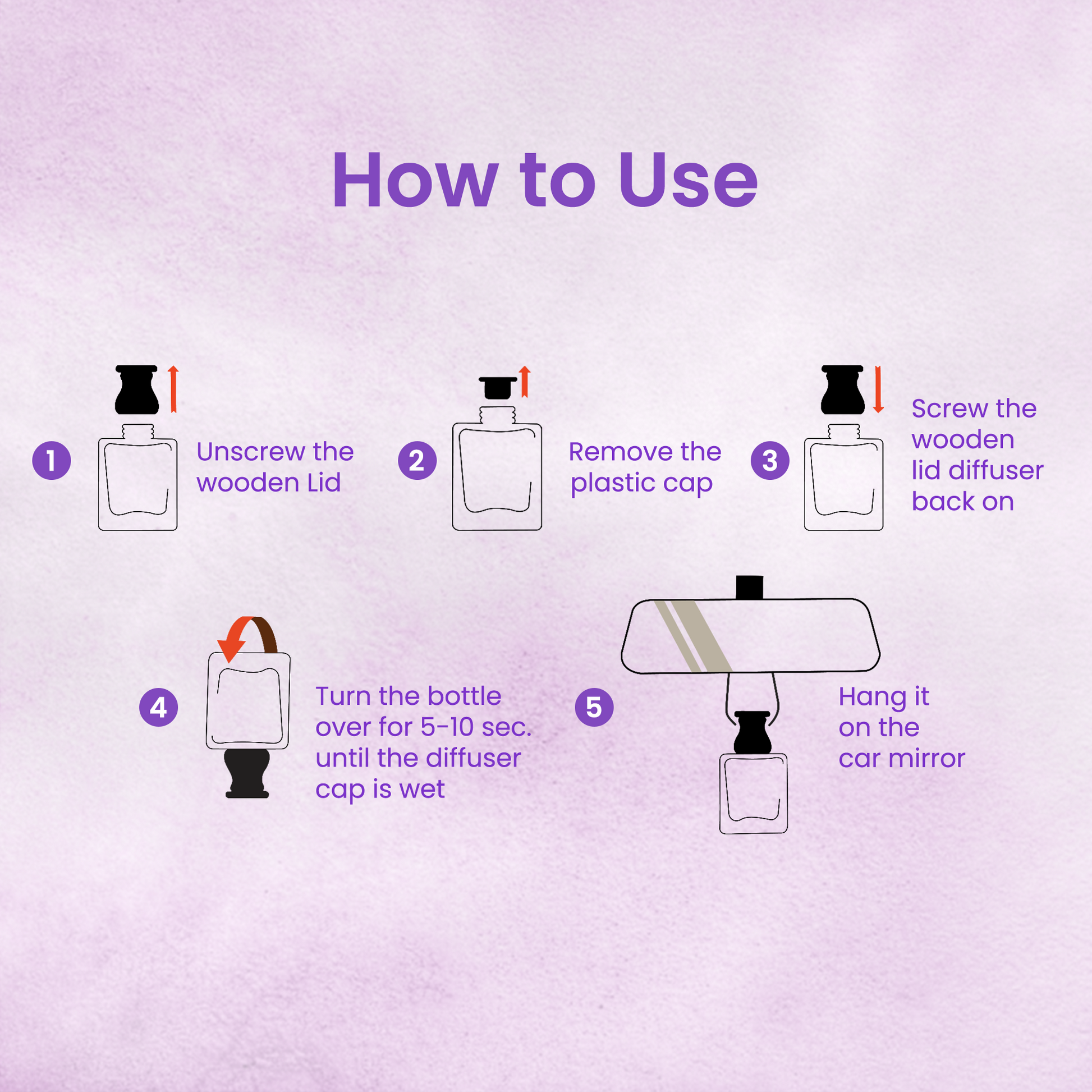 After removing the plastic stopper and securing the wooden diffuser cap, invert the bottle for 10 seconds and hang it on the rear-view mirror.