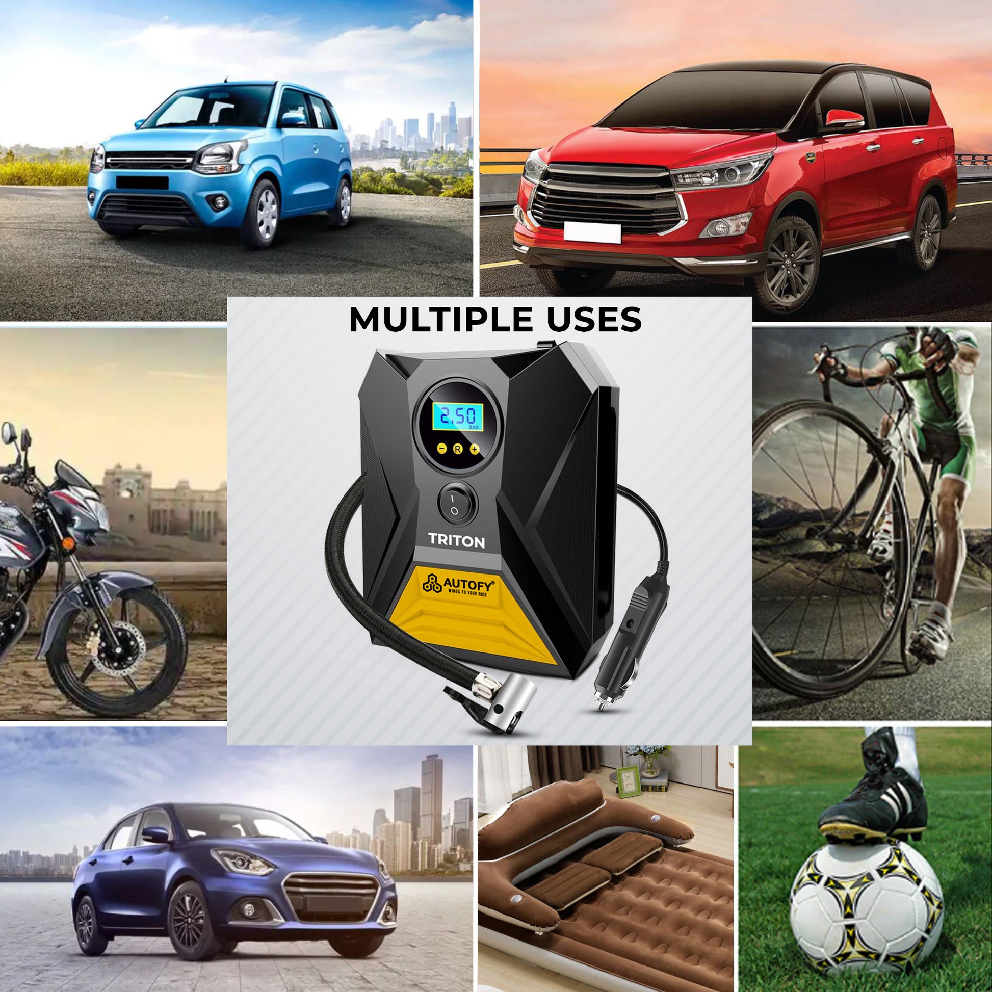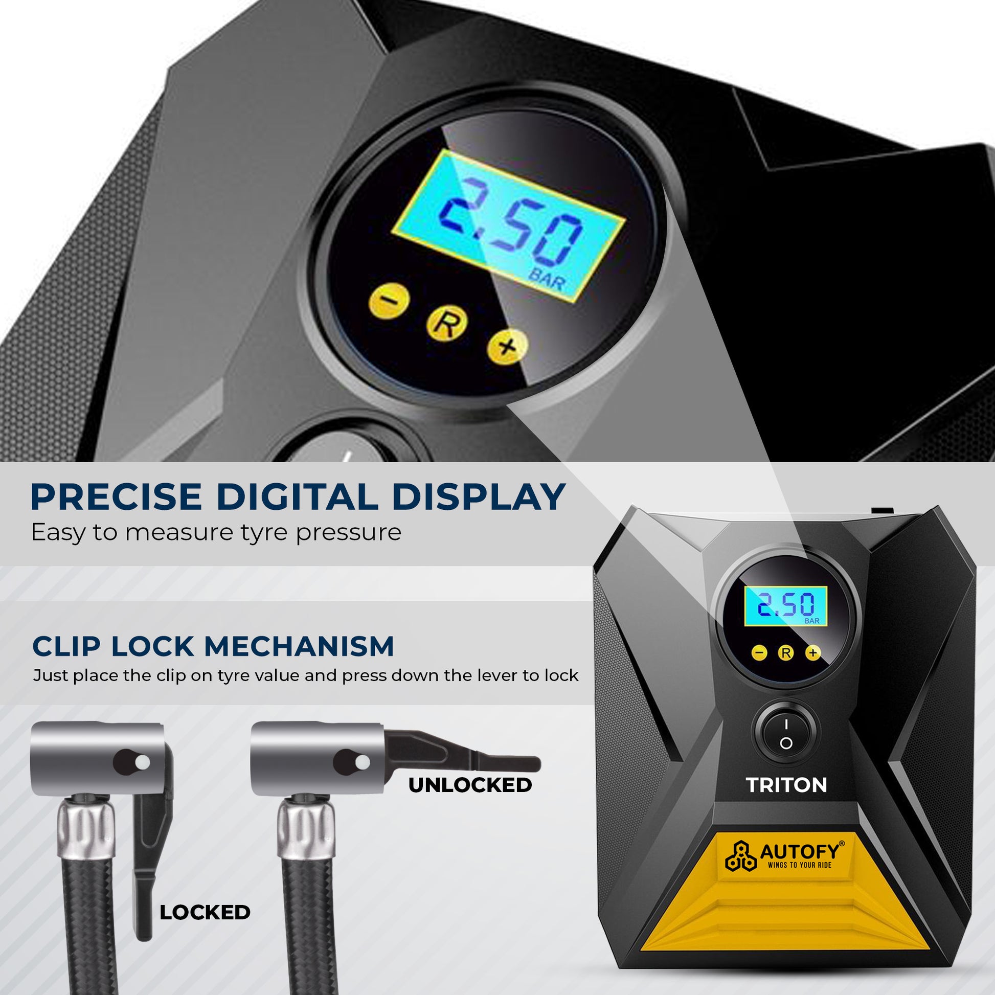 The Autofy TRITON Tyre Inflator can handle up to 150 PSI of air pressure with a 35L/min airflow rate.